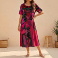 Crafted from a soft, breathable fabric, this dress features a relaxed fit, gentle scoop neckline, and comfortable short sleeves, ensuring absolute comfort even on the warmest days. The elegant midi length offers versatile styling, while the artistic print adds a touch of bohemian sophistication. Pair it with flat sandals and a straw tote for a casual daytime ensemble, or elevate it with espadrille wedges and delicate jewelry for an evening affair.