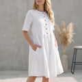 Expertly crafted from a premium, soft linen fabric, this dress features a gently cinched waist that gracefully flows into a knee-length skirt, ensuring a flattering silhouette for all body types. The natural texture of the linen provides a sophisticated yet relaxed feel, while the short sleeves and elegant neckline offer a timeless charm. Pair it with delicate jewelry and espadrille sandals for a classic daytime look, or add a wide-brimmed hat and an oversized tote for an elevated resort aesthetic.