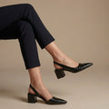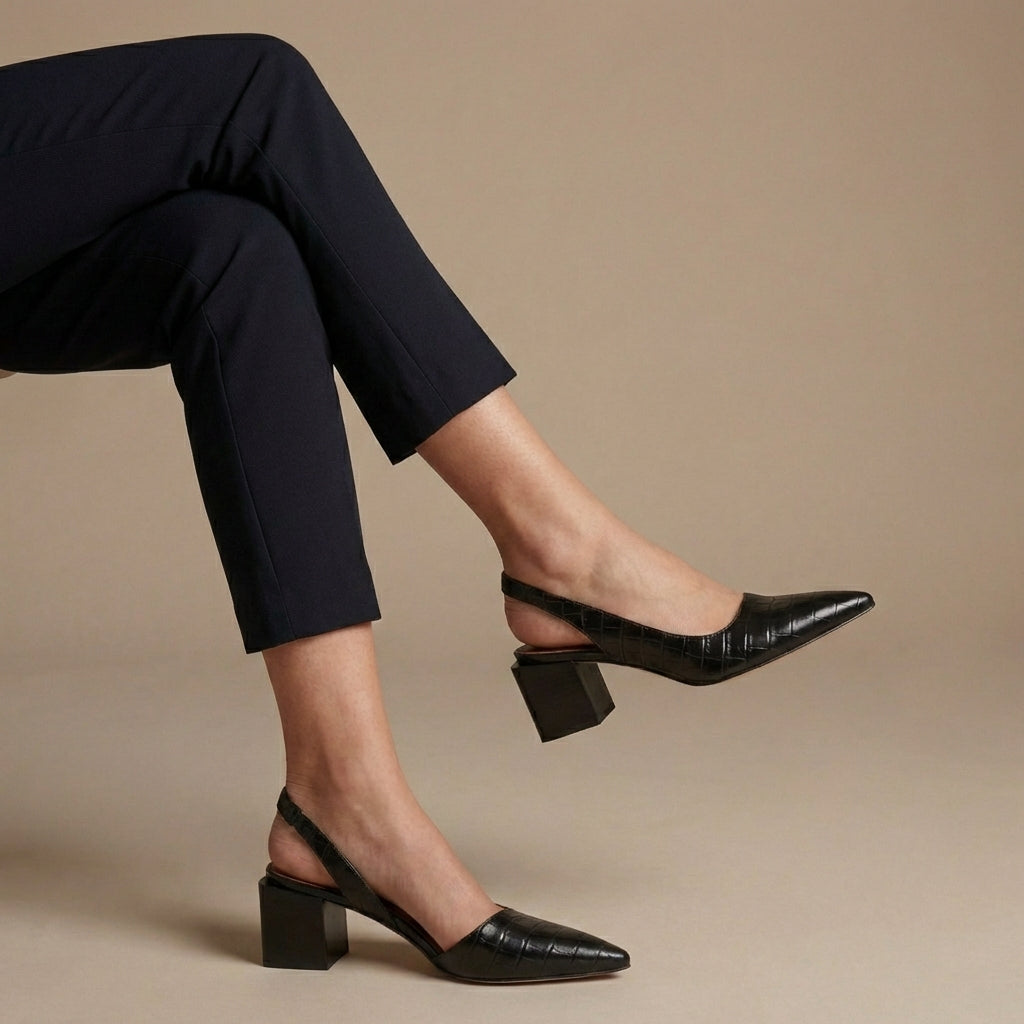 Crafted from luxurious embossed leather, these pumps feature a distinctive croco texture that adds depth and character to any ensemble. The sleek pointed toe and comfortable block heel provide a refined silhouette, while the slingback strap ensures a secure and elegant fit. Elevate your look by pairing them with tailored separates for the office or a vibrant midi dress for an evening out.