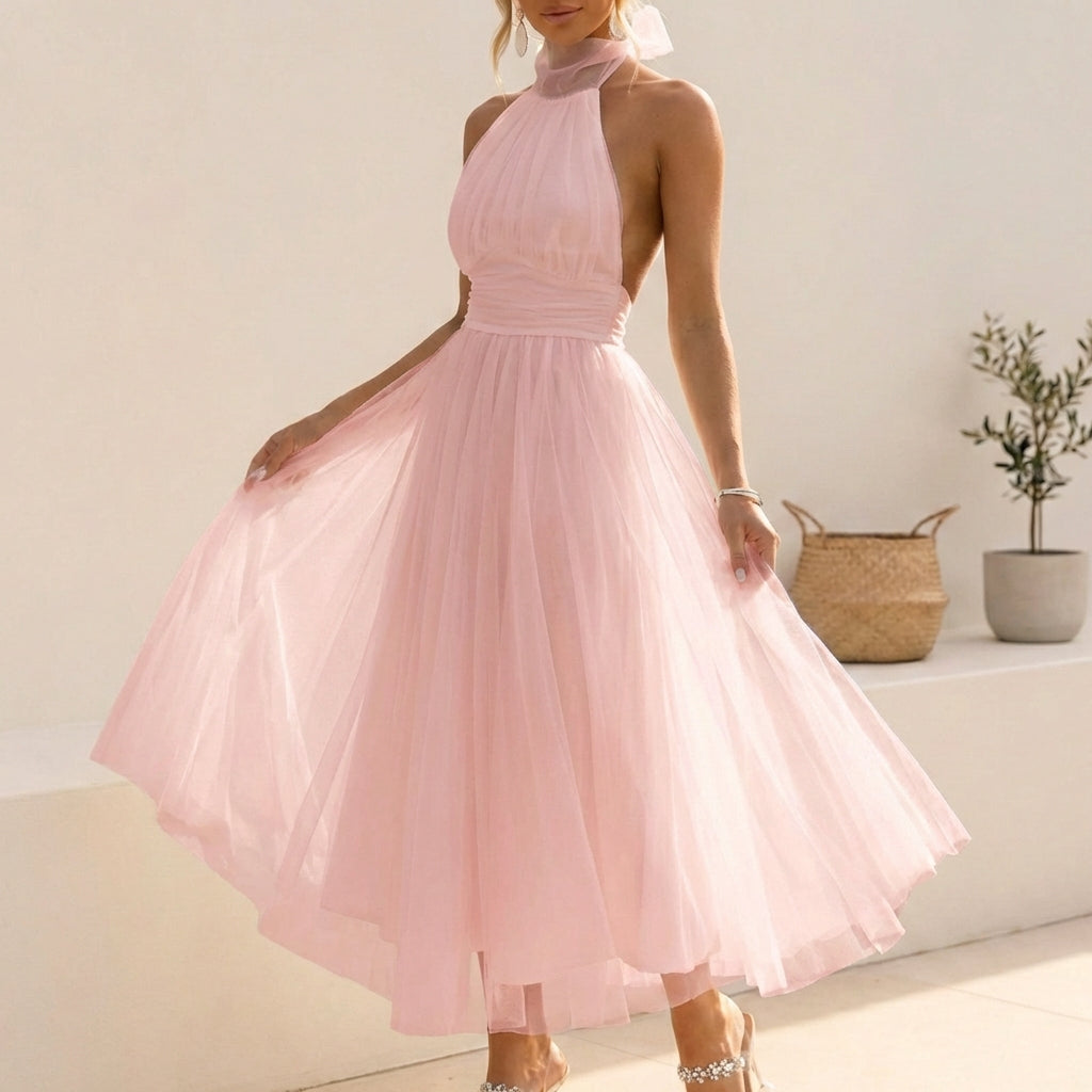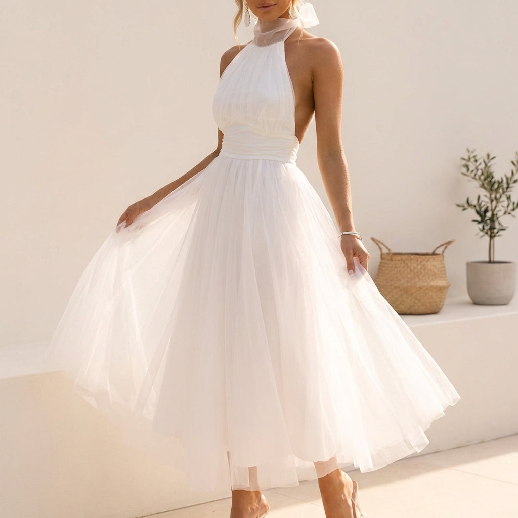 This piece features a delicate sheer neckline that transitions into a stunning open-back silhouette, offering a hint of allure balanced by a sophisticated midi length. The bodice is meticulously gathered to highlight the waist, flowing seamlessly into a voluminous skirt crafted from layers of fine mesh for a cloud-like movement. To complete the look, style it with statement earrings and a pair of translucent block heels.