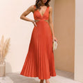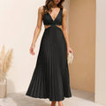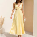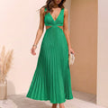 Crafted from luxurious satin, the dress drapes beautifully, offering a flowing silhouette that moves with elegant ease. Its sleeveless design features a flattering V-neck and a meticulously ruched bodice, leading to artfully placed cut-outs at the waist. The midi-length skirt, with its delicate pleats, adds a touch of refined movement. Pair with shimmering sandals and minimalist jewelry for an elevated summer look.