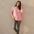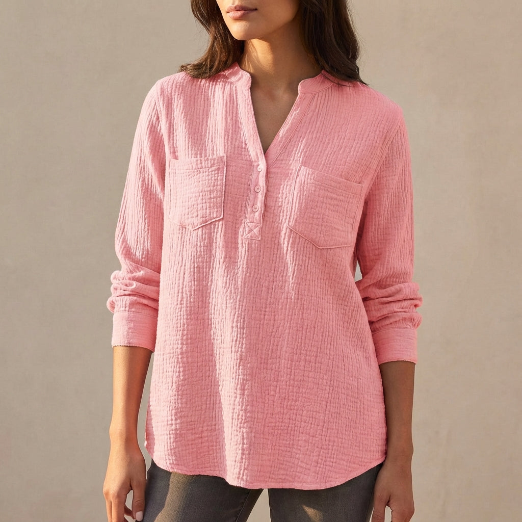 Crafted from a lightweight, breathable textured fabric, this blouse drapes naturally for a relaxed and flattering fit. The soft split neckline with a partial button front adds subtle structure, while the dual chest pockets introduce a touch of utility-inspired style. Finished with long sleeves and a gently curved hem, it pairs beautifully with trousers, denim, or skirts for versatile everyday wear.
