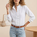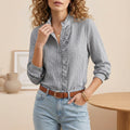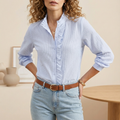 Crafted from a breathable, textured fabric, this piece offers a delightful tactile experience and superior comfort during warmer days. The design is distinguished by a delicate ruffle trim cascading down the placket and framing the neckline, adding a touch of vintage-inspired charm without overwhelming the clean lines. Softly gathered elastic cuffs create a subtle balloon sleeve effect, enhancing the relaxed yet structured fit. Pair with tailored linen trousers and leather slides for a look that is both chic and comfortable.